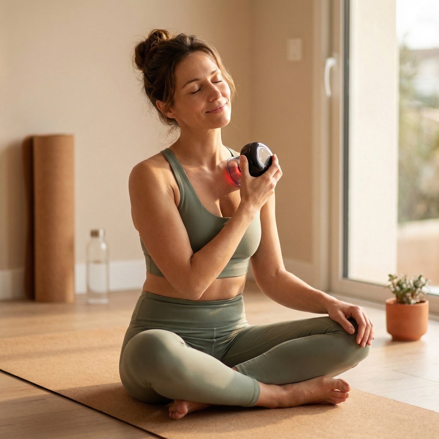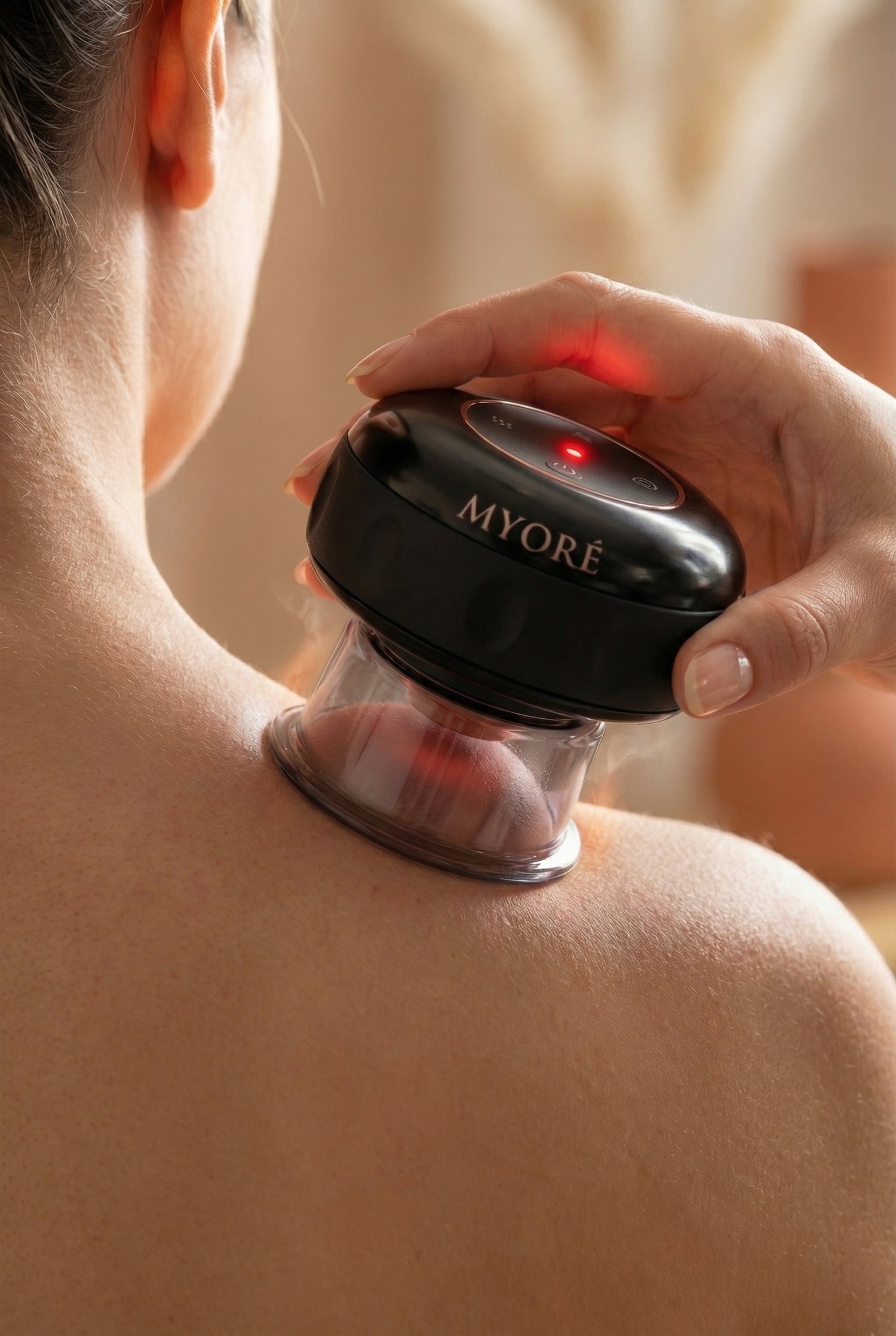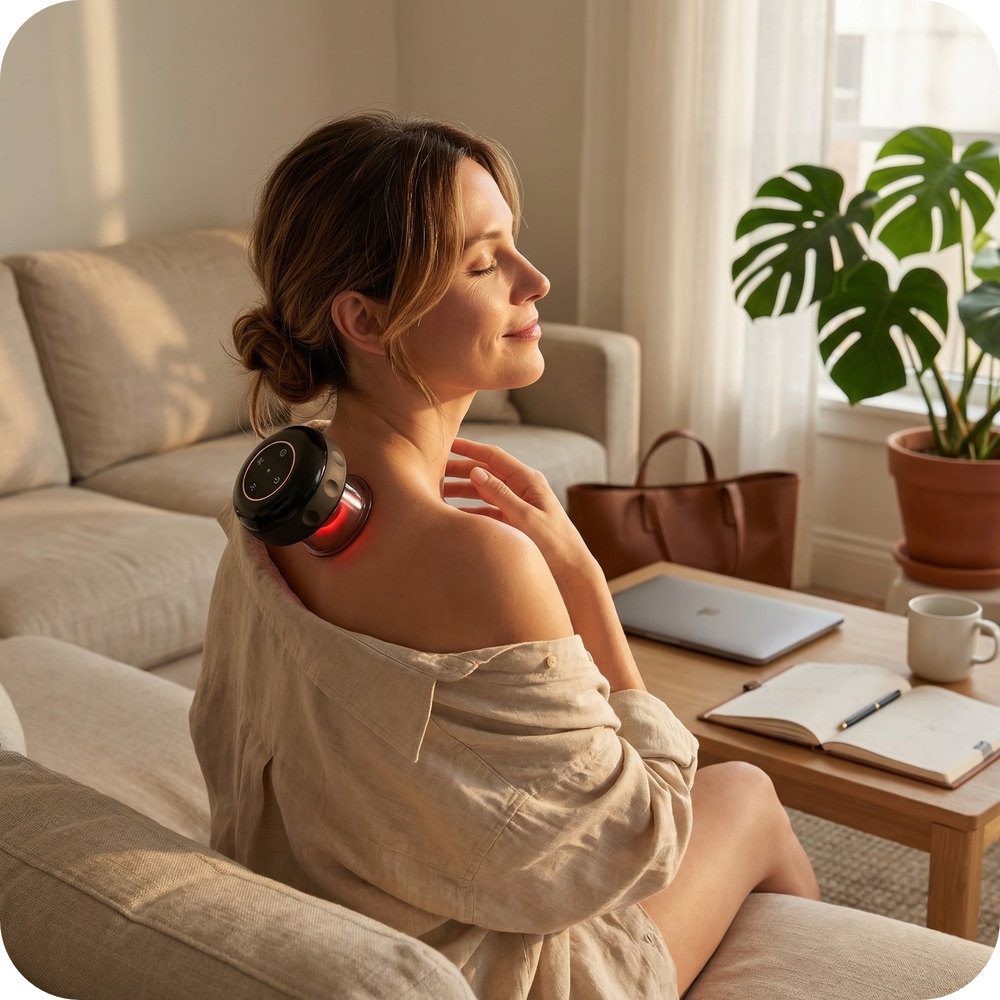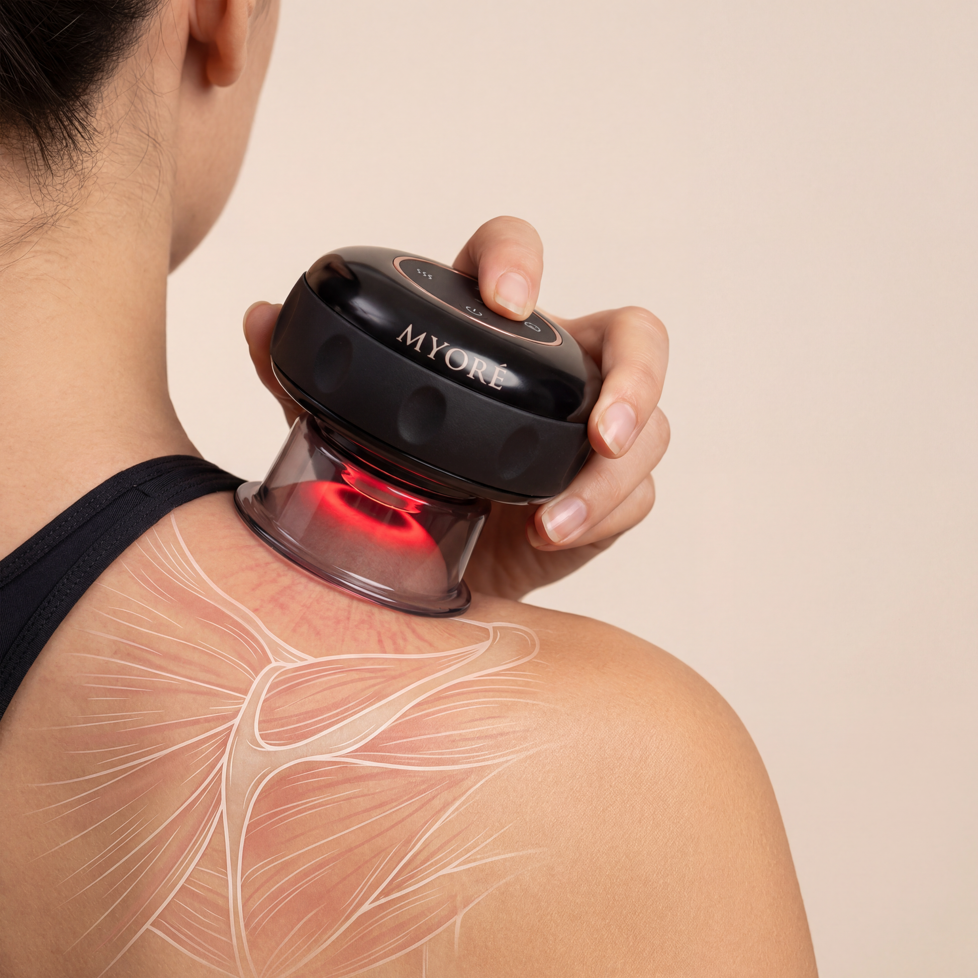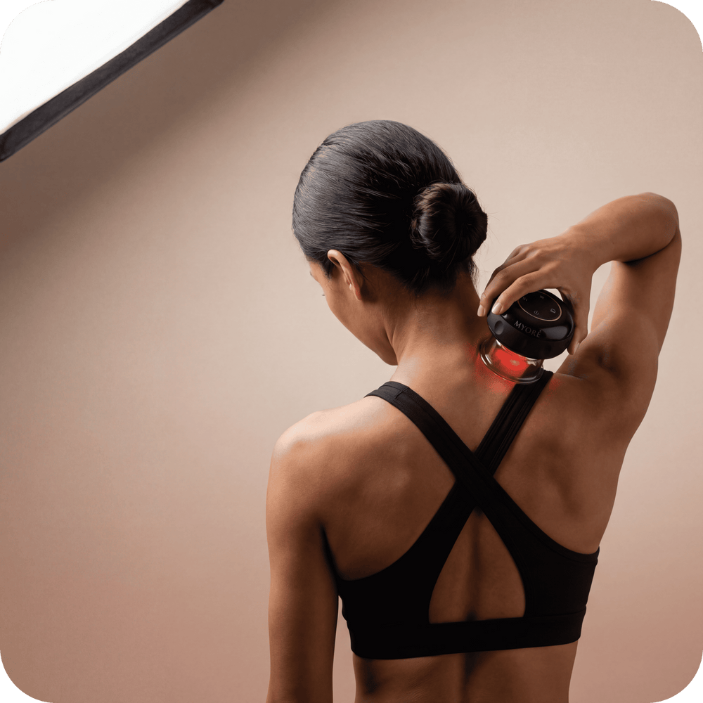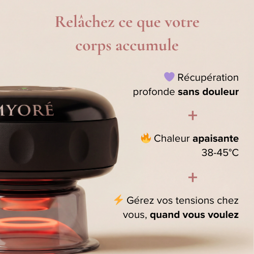 Posez MYORÉ en statique (points de blocage) ou faites-la glisser (circulation). Elle s'arrête automatiquement après 10 minutes. Résultat : épaules relâchées, dos détendu, circulation relancée.