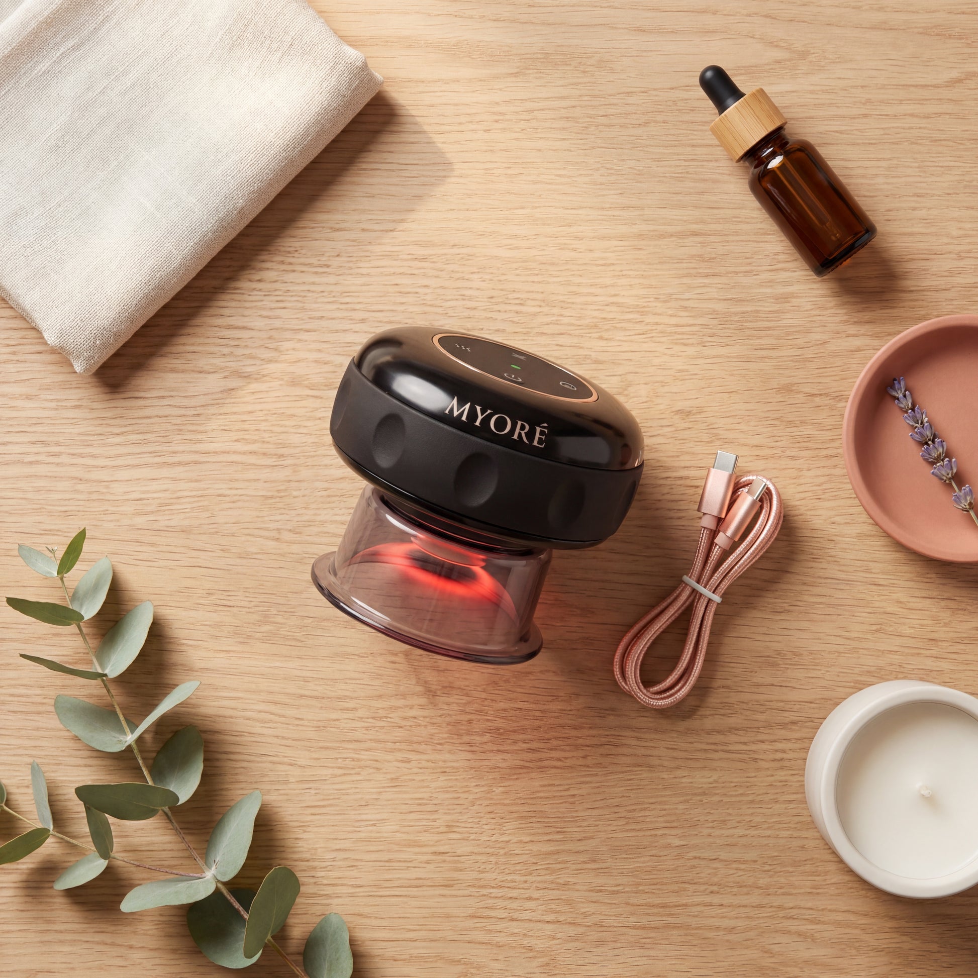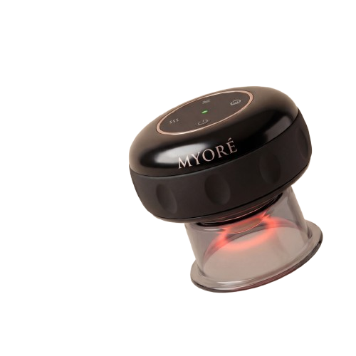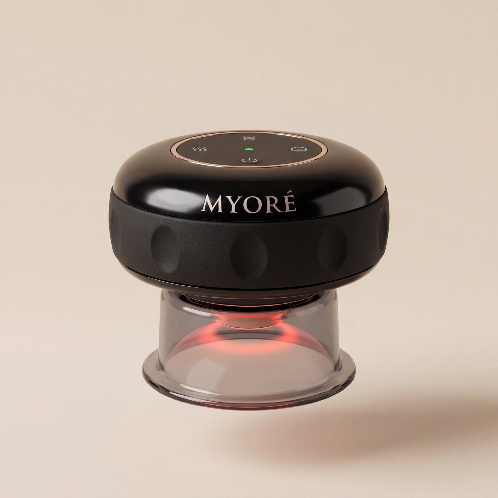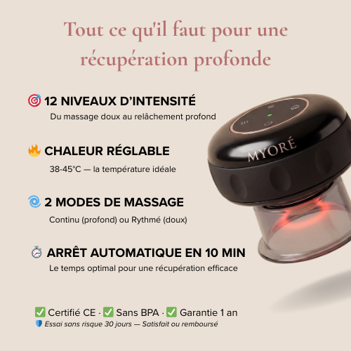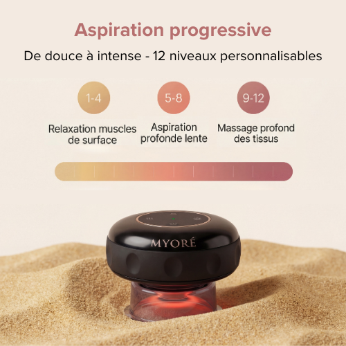 12 niveaux d'aspiration, 2 modes de massage (continu ou rythmé), chaleur réglable. Commencez faible, augmentez progressivement. MYORÉ s'adapte à vous — pas l'inverse.